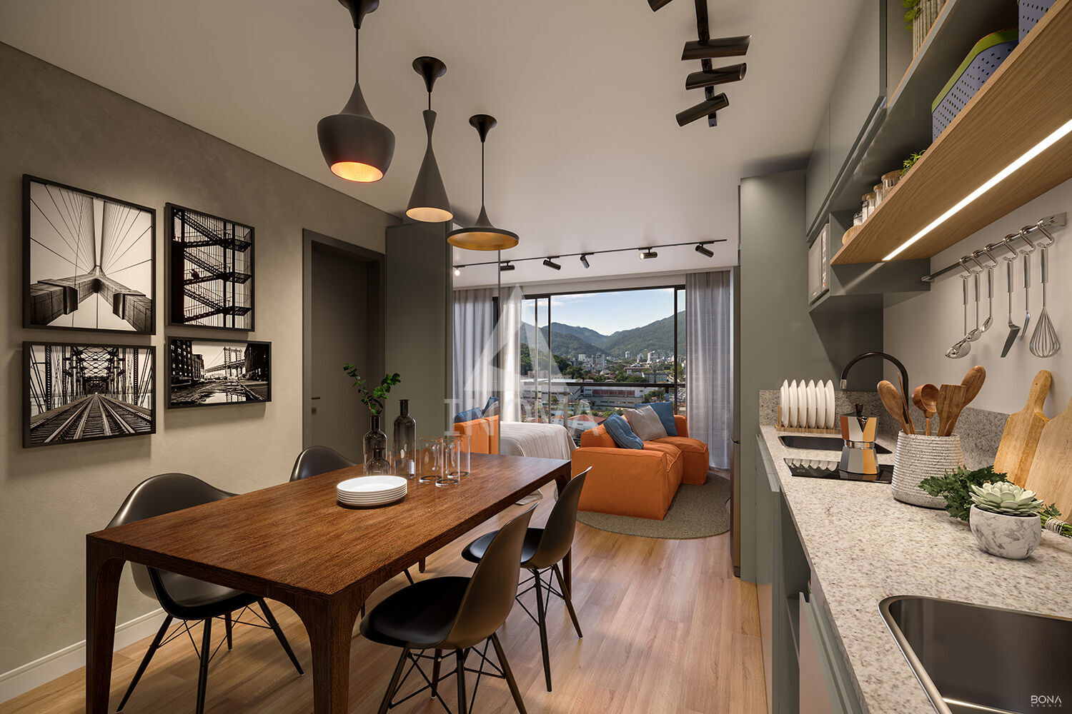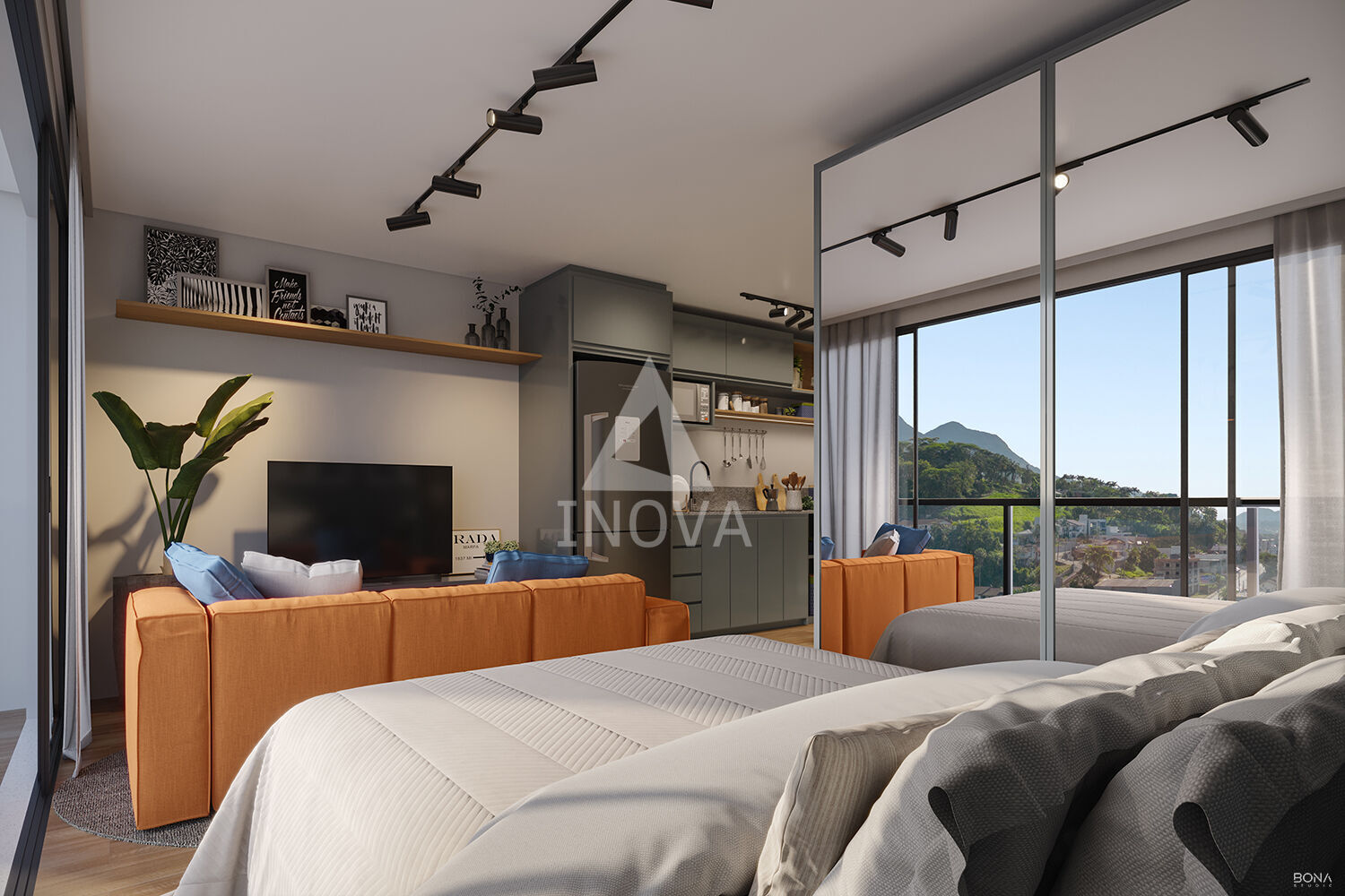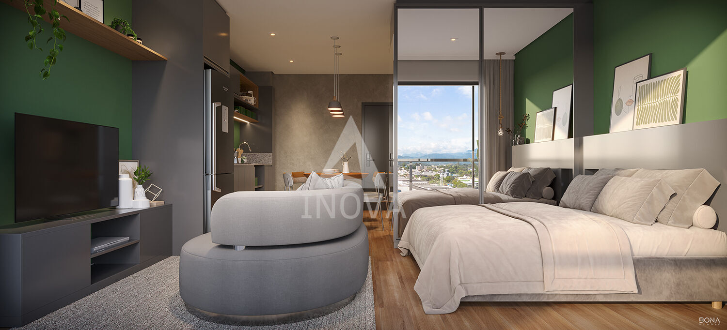 Os studios, com áreas entre 33,68m² e 35,85m², são entregues totalmente mobiliados e decorados, prontos para morar ou investir.